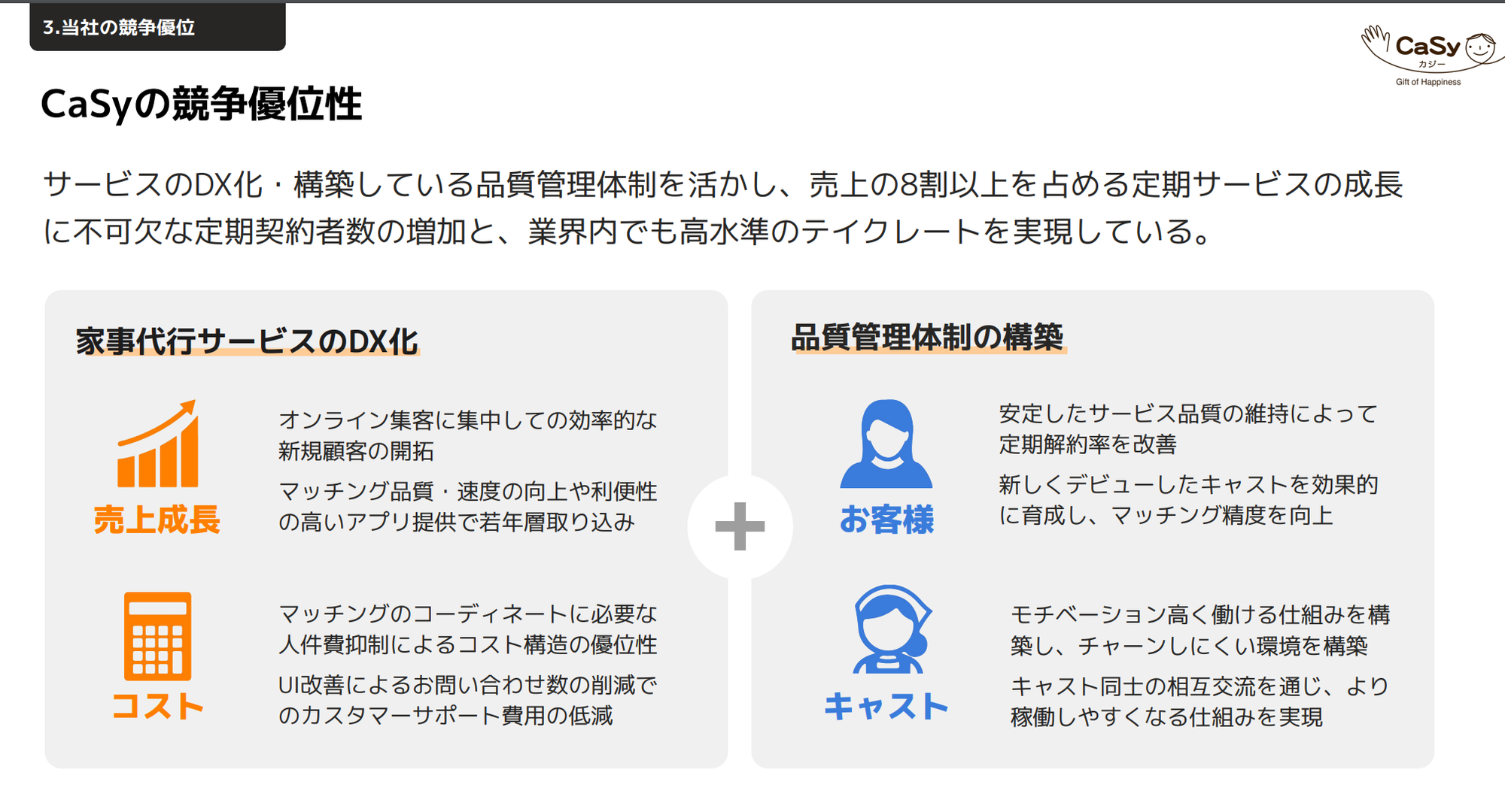まず全体感として、DX化が進んでいない業界にDXを持ち込むことでコスト効率化を進めていることと、品質担保していることが源泉であるというように大きく二つに大別した見せ方がわかりやすい。