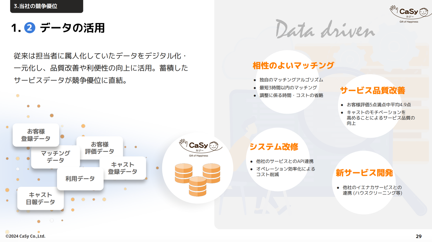 データベースとしてのノウハウが品質や時間短縮の強みになっているという発想が非常に参考になる。